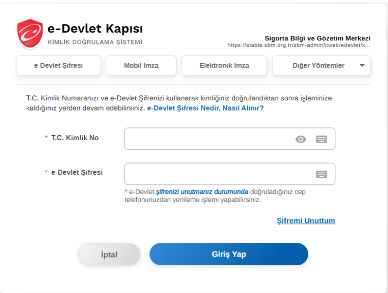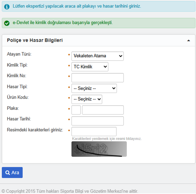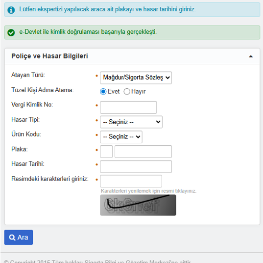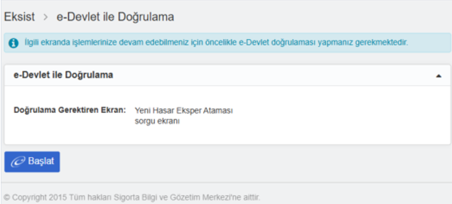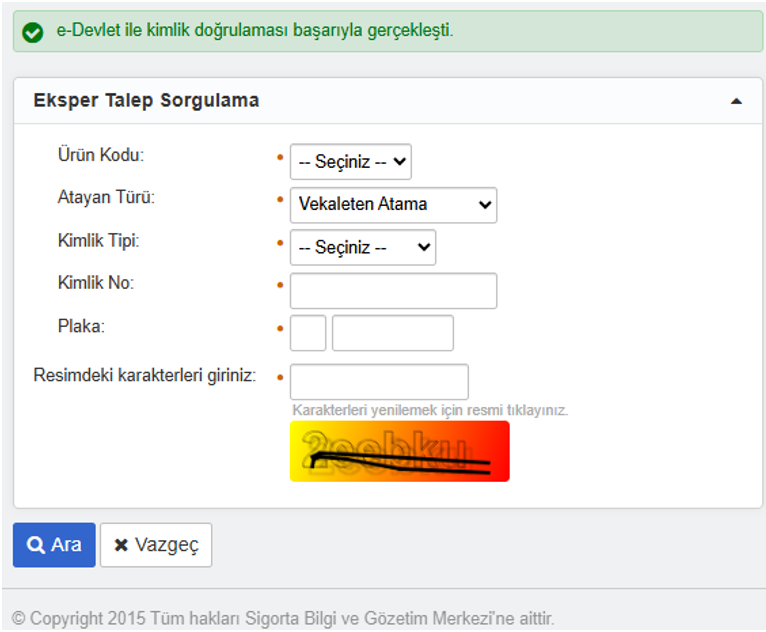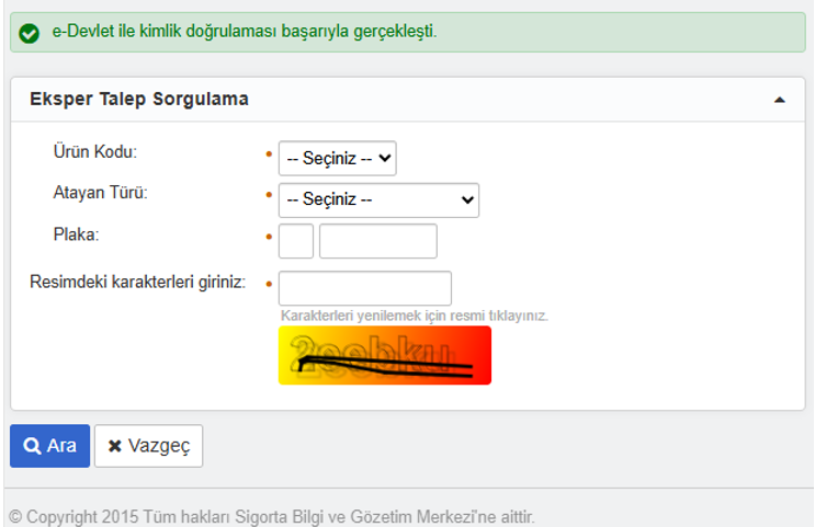 https://online.sbm.org.tr/htm-eksist/public/eksperTalep/sorgu.sbm linkinden aşağıdaki şekilde Trafik ve Kasko ürünü için e-Devlet doğrulaması yapılır.