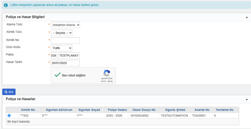 Bir önceki ekranda bulunan "Eksper Atama Durum Sorgulama" butonu kullanılarak atam türü ve plaka bilgisi ile hasar bilgileri detayı sorgulanabilir.
