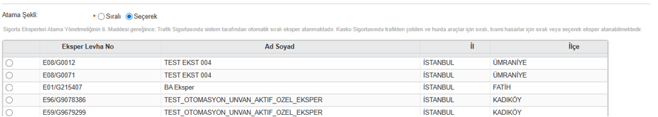 Eğer eksper talep edilecek ürün “Kasko” ise ve hasar tipi “Kısmi Hasar” ise “Atama Şekli” adımında “Seçerek Atama” seçeneği atama talebini yapan kişiye gösterilir. Seçenek işaretlendiğinde atamayı yapan kişiye seçebileceği eksperler liste olarak gösterilir. Atamayı yapan kişi liste içerisinden atanmasını istediği eksperi seçer. Ekranda gösterilen eksper listesi Tamirhane İl ve İlçesine göre listelenmektedir.